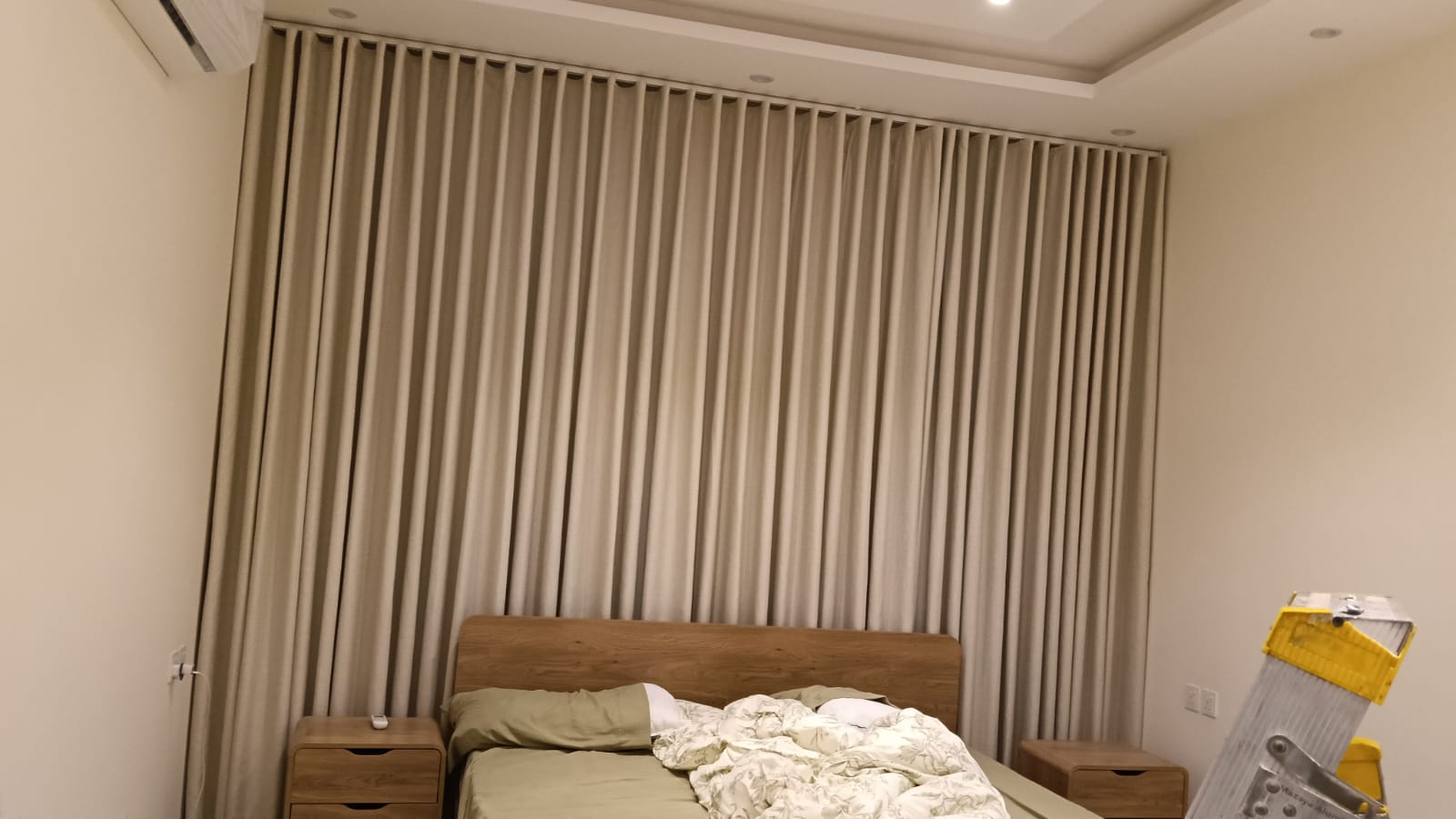 Modern automated curtains with remote and app control, perfect for contemporary Saudi smart homes.