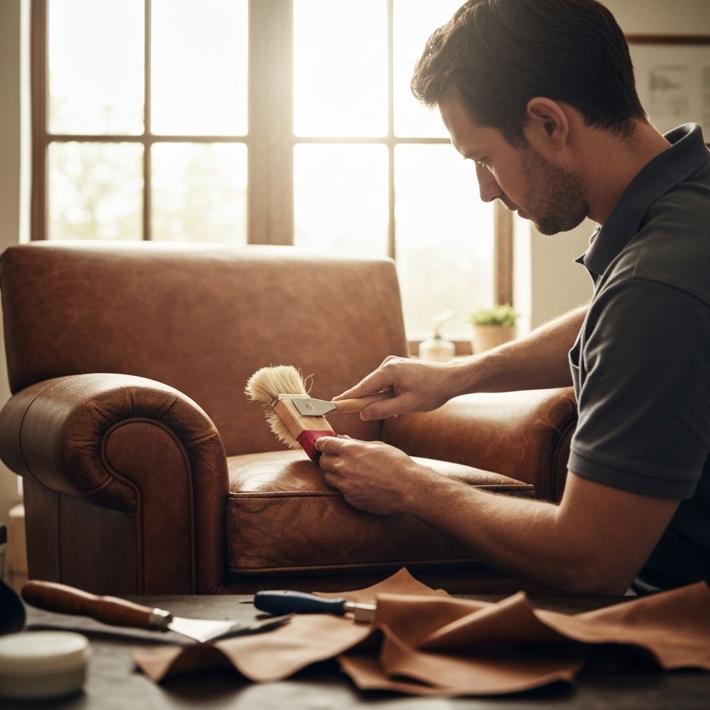 Expert leather restoration, conditioning, color matching, and repair for premium leather furniture pieces.