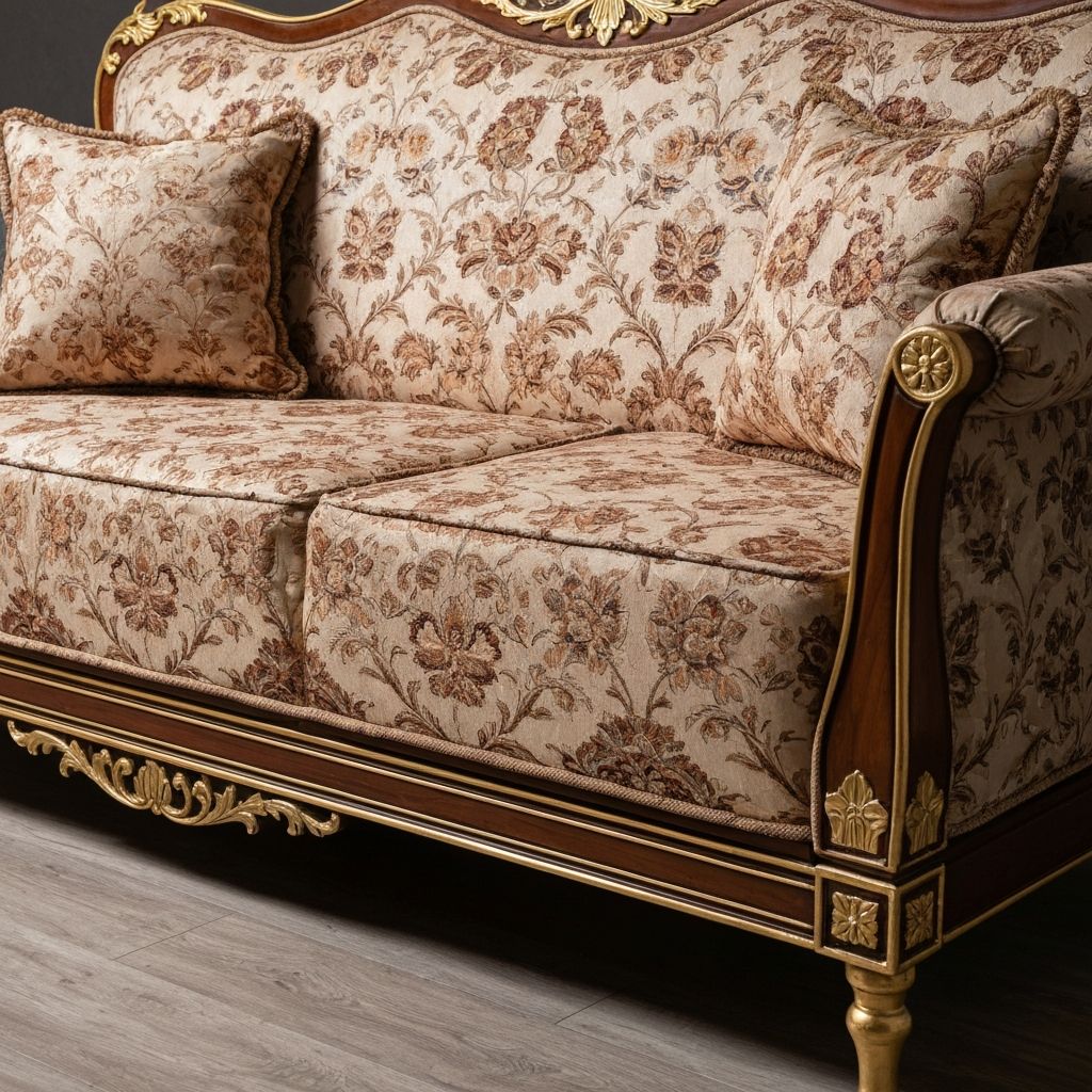 Specialized restoration for traditional majlis seating, including floor cushions, sofas, and ornate carved pieces.